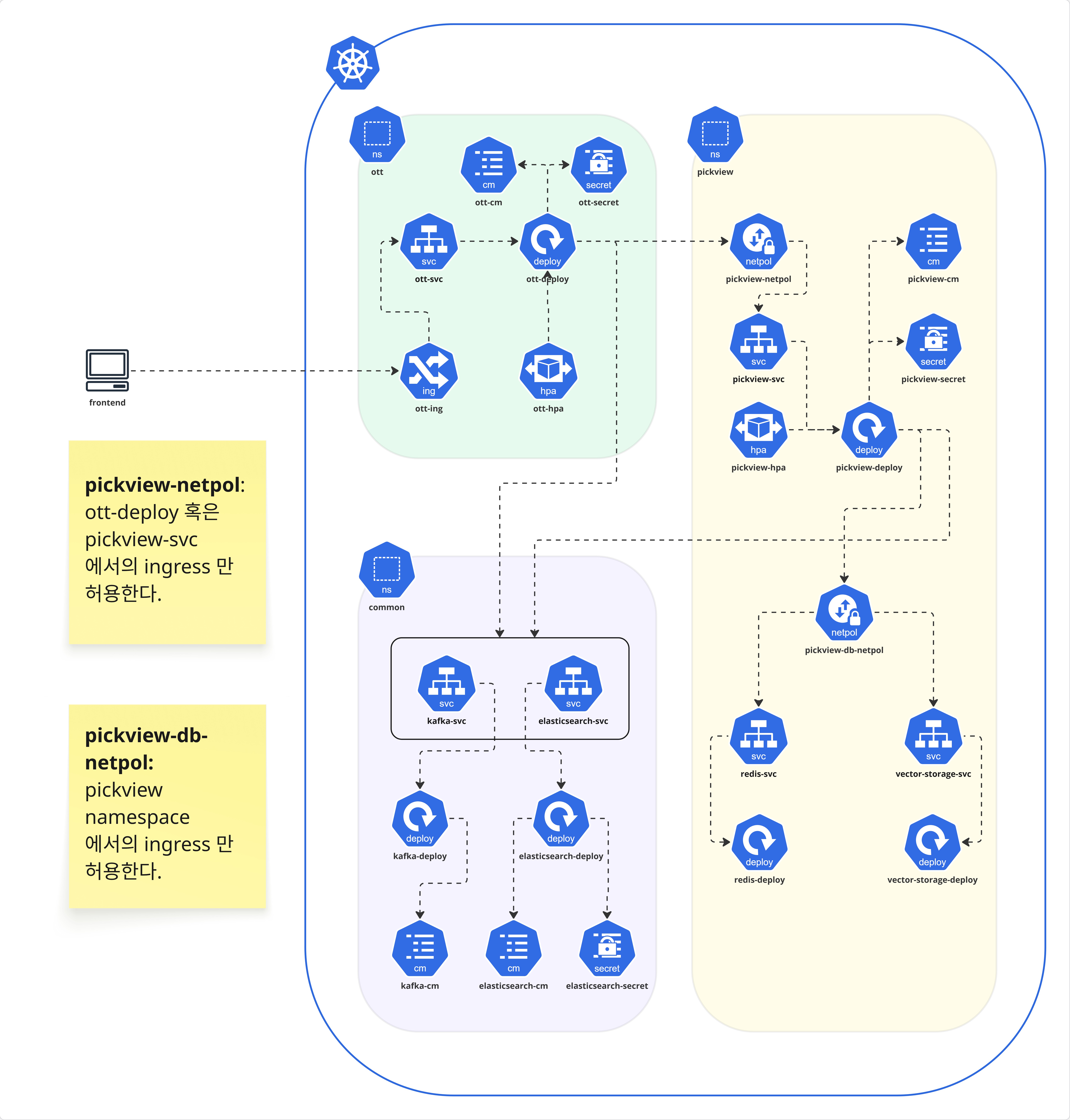 - Infrastructure : Docker, Kubernetes (네임스페이스 분리, Network Policy 적용)